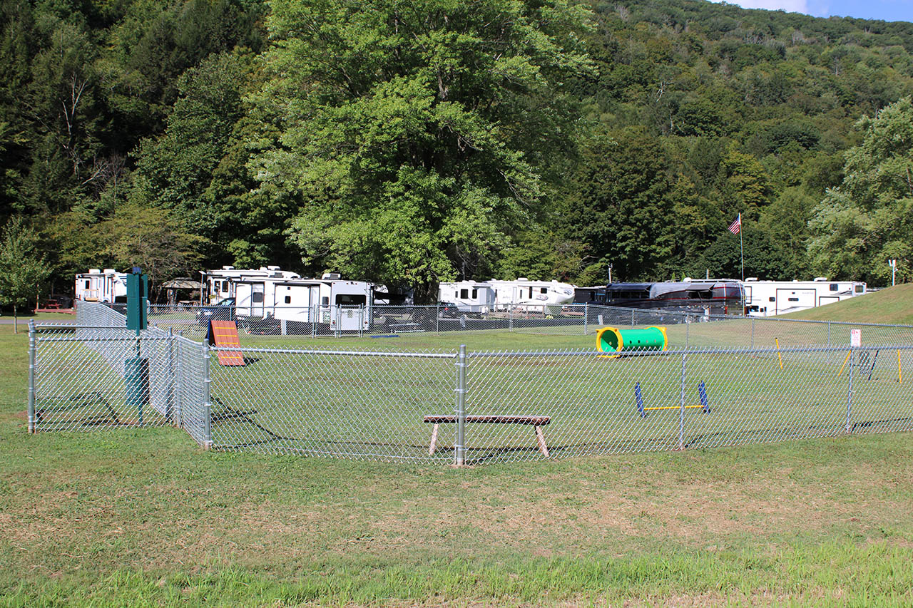 A: Yes! Pets are welcome on leash throughout the campground, and we have a fenced dog park just for them. Pets are not permitted in cabins or inside the pool area.